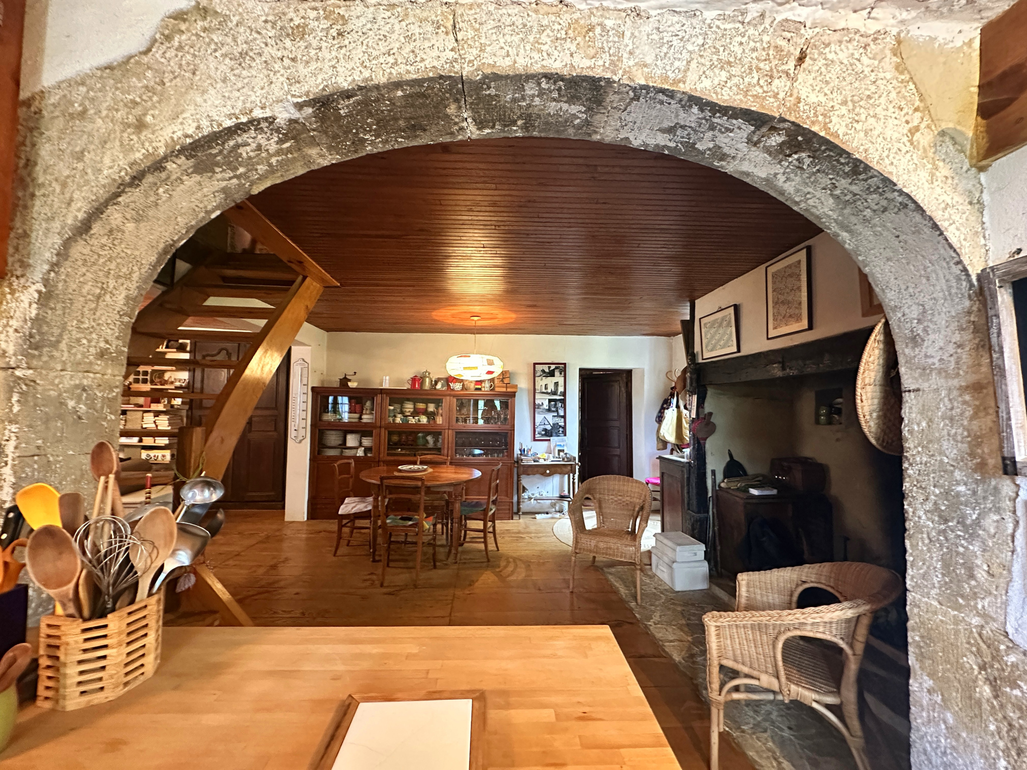 Grande pièce de vie chaleureuse, avec cuisine dans un espace voûté unique