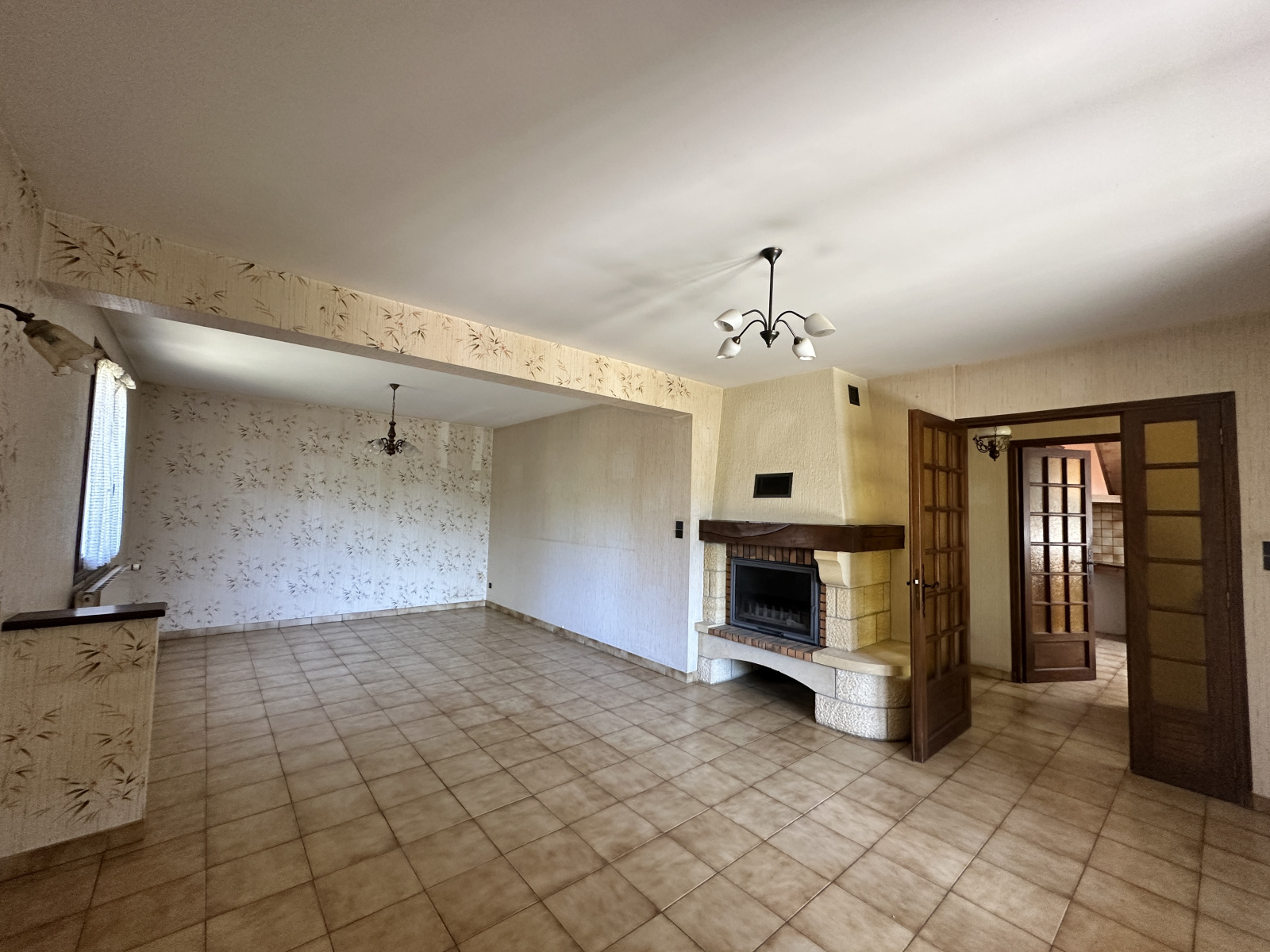Une pièce de vie lumineuse avec cheminée et insert, ouverte sur une terrasse exposée Est