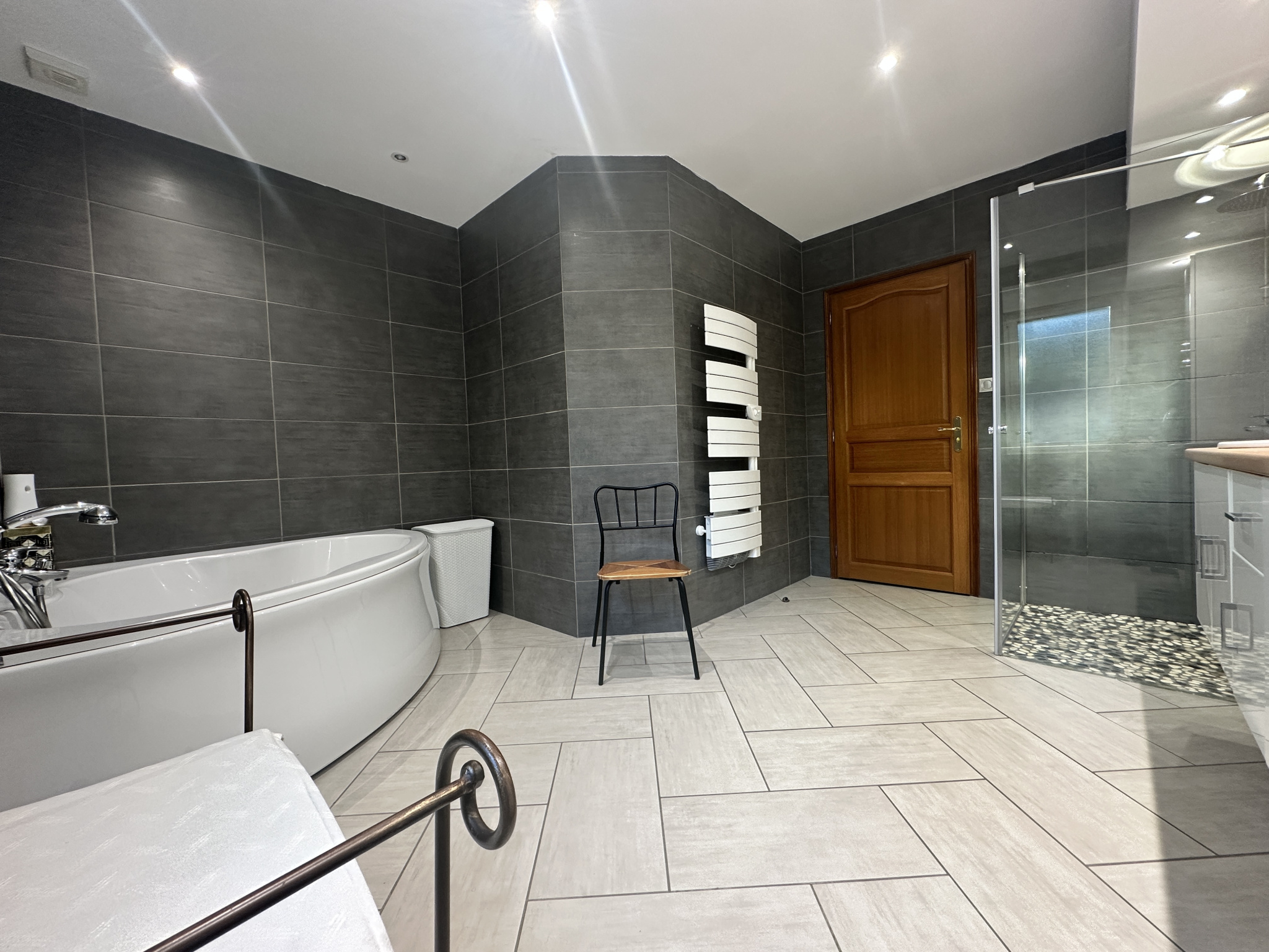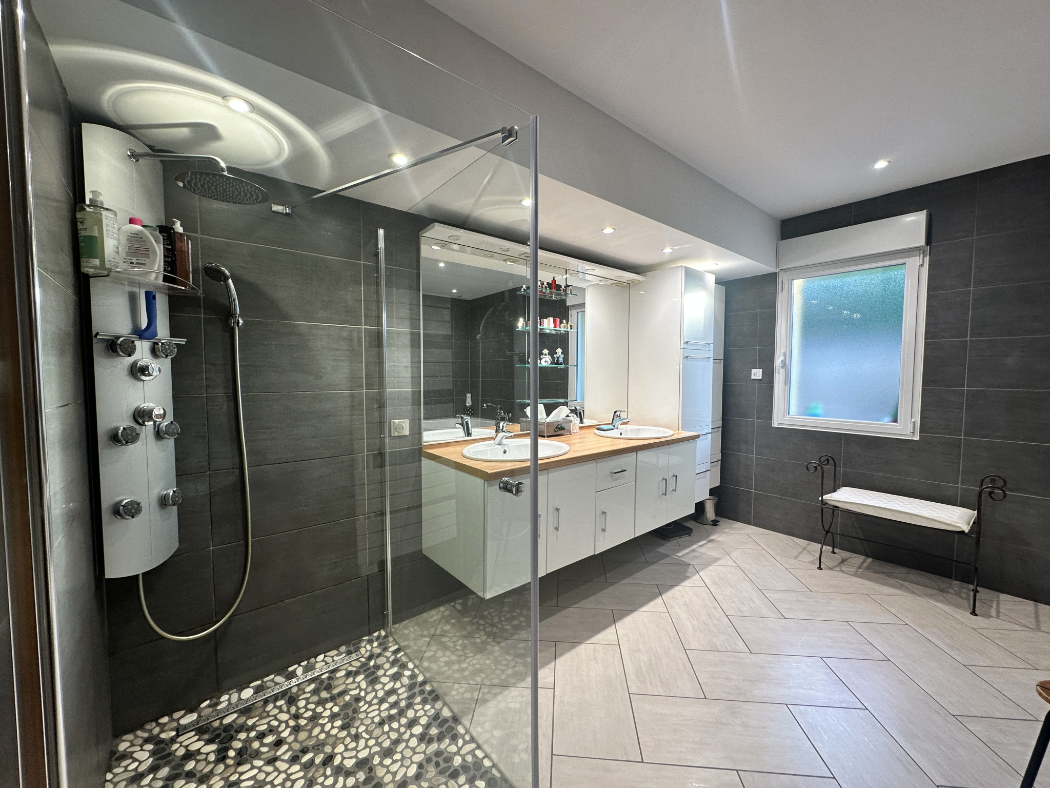 La salle de bains, pensée comme un véritable espace bien-être, se pare d’une baignoire d’angle, d’une douche à l’italienne, et d’une double vasque aux lignes contemporaines — un lieu où élégance et détente s’accordent à la perfection.