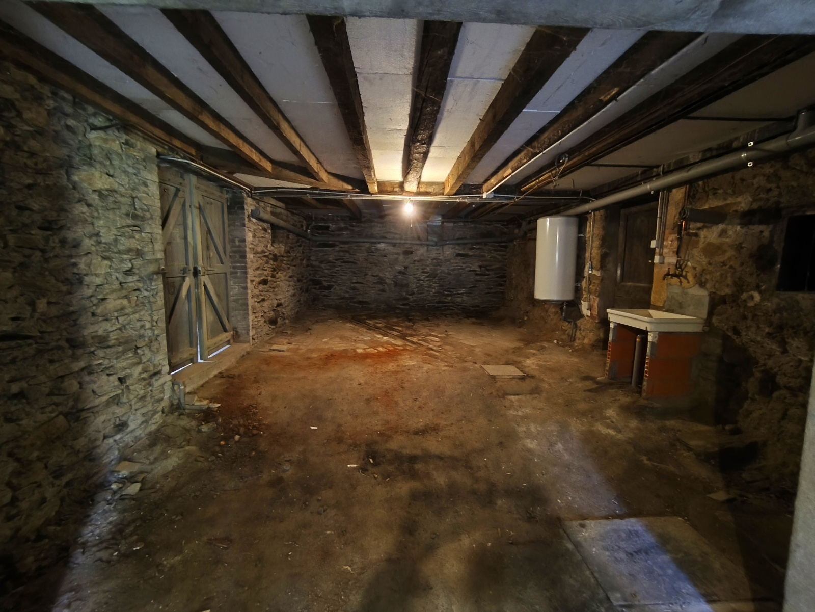 Sous-sol complet de 150 m² avec garage, atelier et espace de rangement.